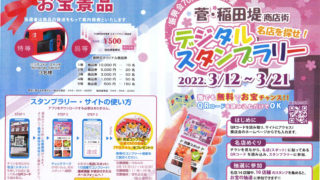 稲田堤振興会の主催したスタンプラリーです。ご参加ありがとうございました。抽選で283名様に素敵な景品と商品券を差し上げます。更に14店舗すべてコンプリートした先着600名様には寅の干支タオルをプレゼント。交換場所は菅会館です。